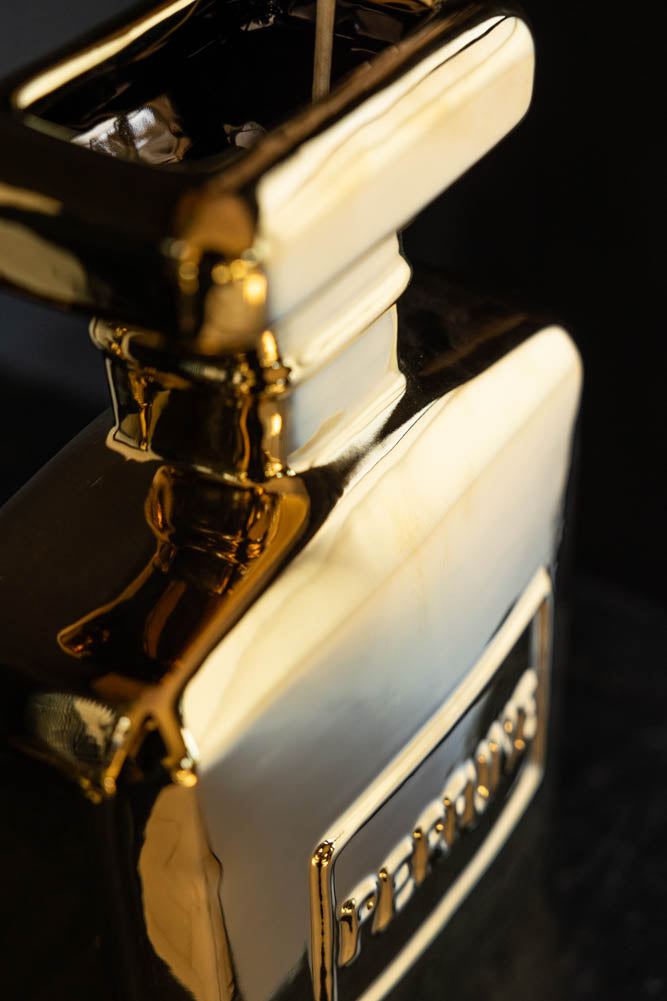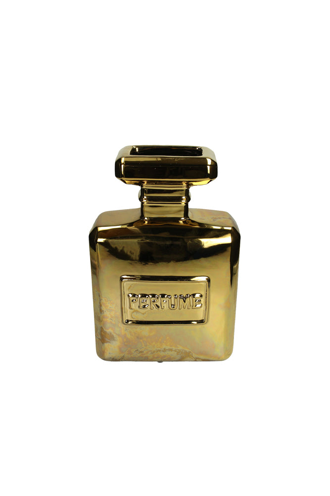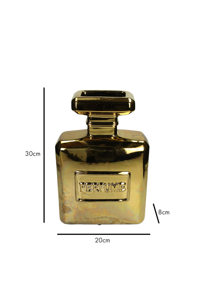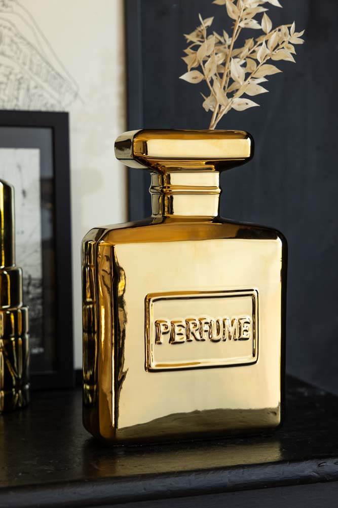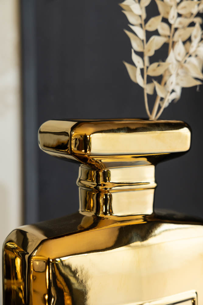 Taking style notes from your dressing table, the Gold Perfume Bottle Vase introduces effortless glamour to any corner of the home. Why oft for a plain glass vase when you could introduce this glorious gold design to your living room shelves? As a symbol of luxury, the finest fragrances always include beautiful bottles that are a work of art. Inspired by this tradition, the gold vase reveals a classic square perfume bottle shape reminiscent of vintage perfume and features a high-shine gold finish for an extra dose of grandeur. A tall vase that promises to make a statement; fill yours with your favourite flowers or foliage and style it against beautiful black and white artwork for interior glamour goals. - Gold perfume bottle large vase - Measures: H30cm x W20cm x D8cm - Made from fine earthenware - Also available in black