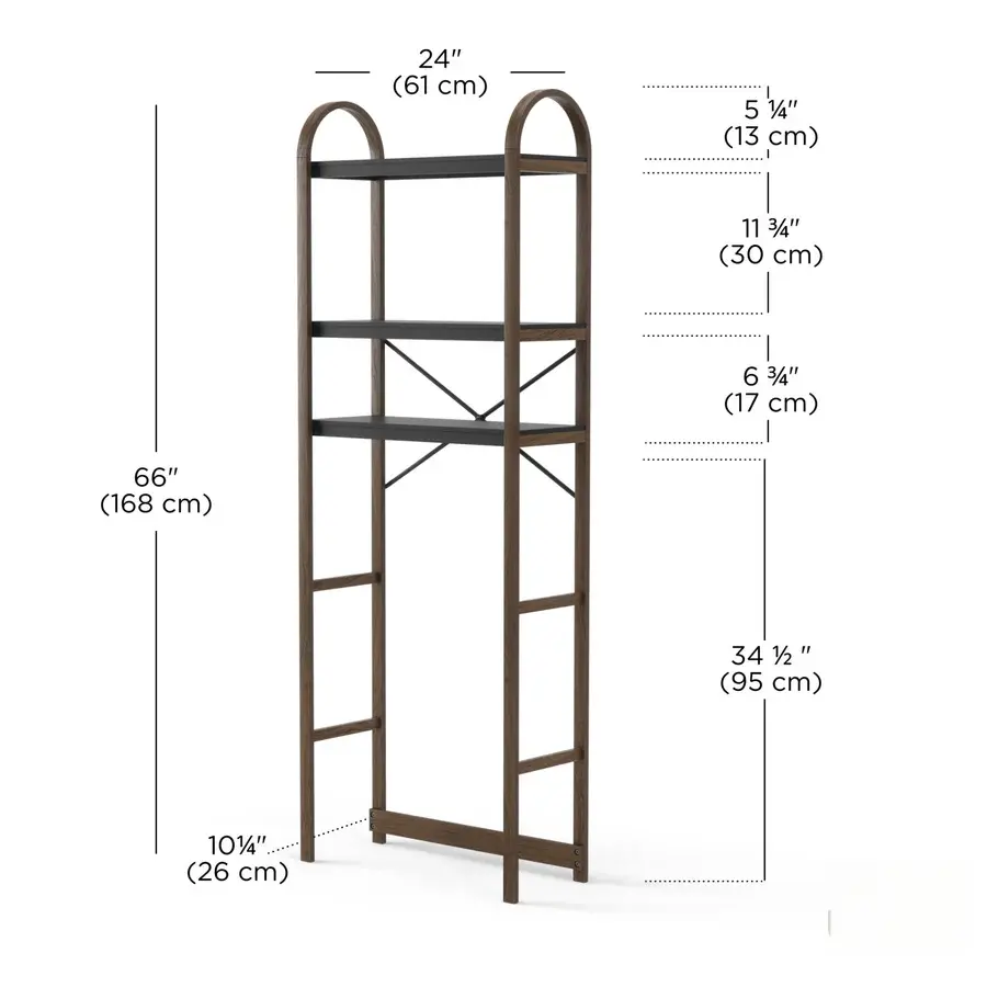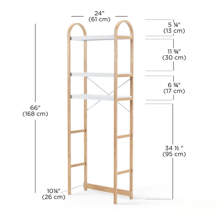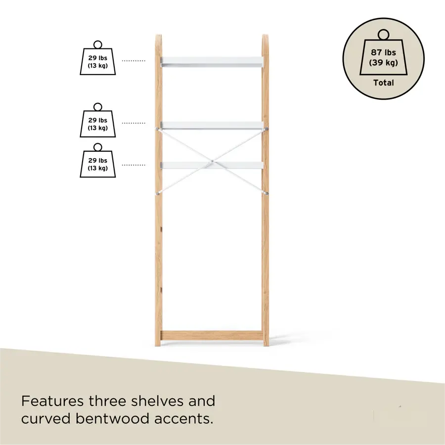 Instantly declutter and provide extra storage in your bathroom with Bellwood Over the Toilet Shelf. With three tiers, each with a dowel bar to hang items like towels, this freestanding storage unit provides storage space where you need it most. Easy to assemble, Bellwood includes rubber feet and a furniture safety strap. Bellwood is part of Umbra's Bellwood Family including a matching side table, coffee table, umbrella stand, wall shelves, freestanding shelves and more. Holds 13kg (29lbs) per shelf. Measures 10.3 x 24 x 66 inches (26 x 61 x 168 cm). Sourced from renewable wood sources. Wood is a unique natural material with variations in tone, texture, and grain. The product may vary from our imagery. ⓘ For Best Care: use coasters to avoid direct contact to wood surfaces and if you experience a spill, wipe with a damp clean cloth immediately to avoid discoloration.