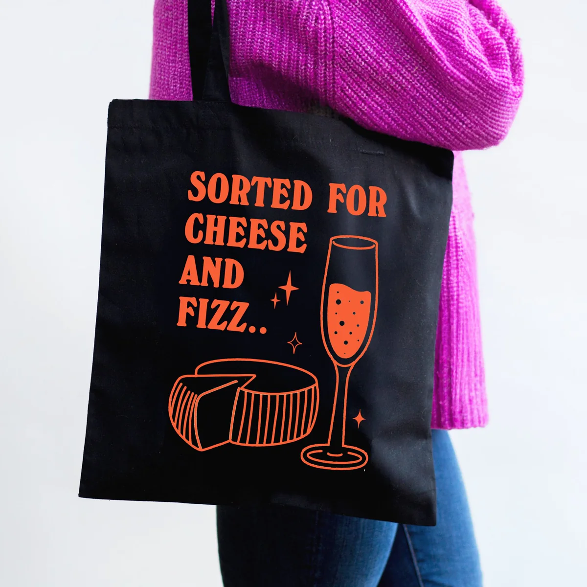 For the indie kid at heart or anyone who loves a clever pun, this cotton tote bag is the ultimate everyday accessory. Featuring retro-style illustrations of cheese and Prosecco alongside our pun 'Sorted For Cheese And Fizz,' this bag is a cheeky nod to the iconic Pulp song 'Sorted For E’s and Wizz.'